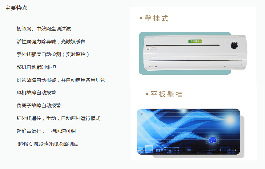 采用室內空氣循環風方式,加裝多層過濾和高效紫外C波段燈管,在迅速過濾掉空氣中塵埃的同時直接殺滅病毒、細菌,阻斷疾病的傳播途徑,