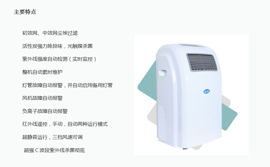 采用室內(nèi)空氣循環(huán)風(fēng)方式,加裝多層過濾和高效紫外C波段燈管,在迅速過濾掉空氣中塵埃的同時(shí)直接殺滅病毒、細(xì)菌,阻斷疾病的傳播途徑